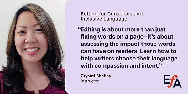 Are you an editor who wants to help writers be more mindful and intentional with their language, especially when it comes to potential harm or bias in their words or representation? I created a course through the Editorial Freelancers Association called “Editing for Conscious and Inclusive Language,” which applies to all types of editors working on all types of writing.